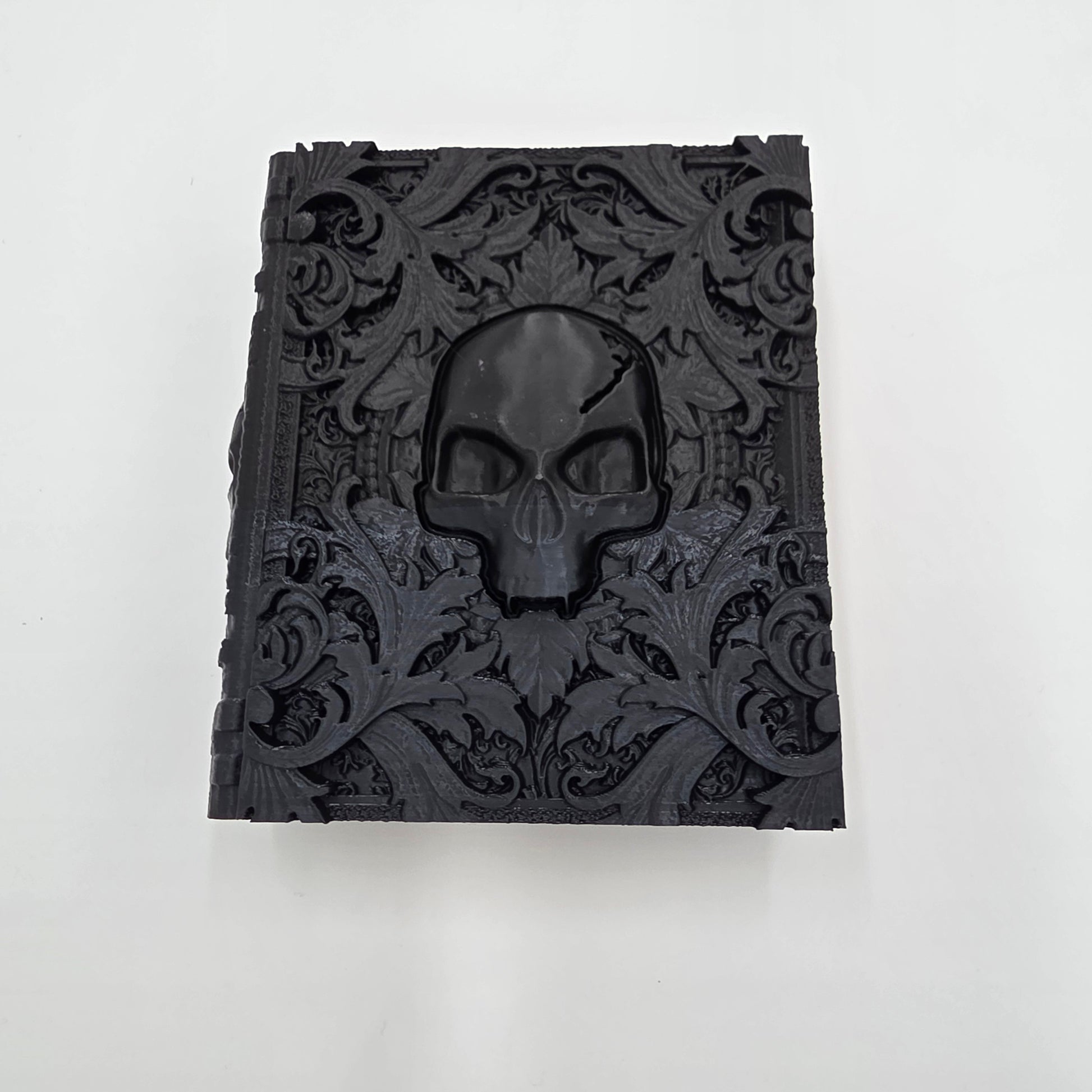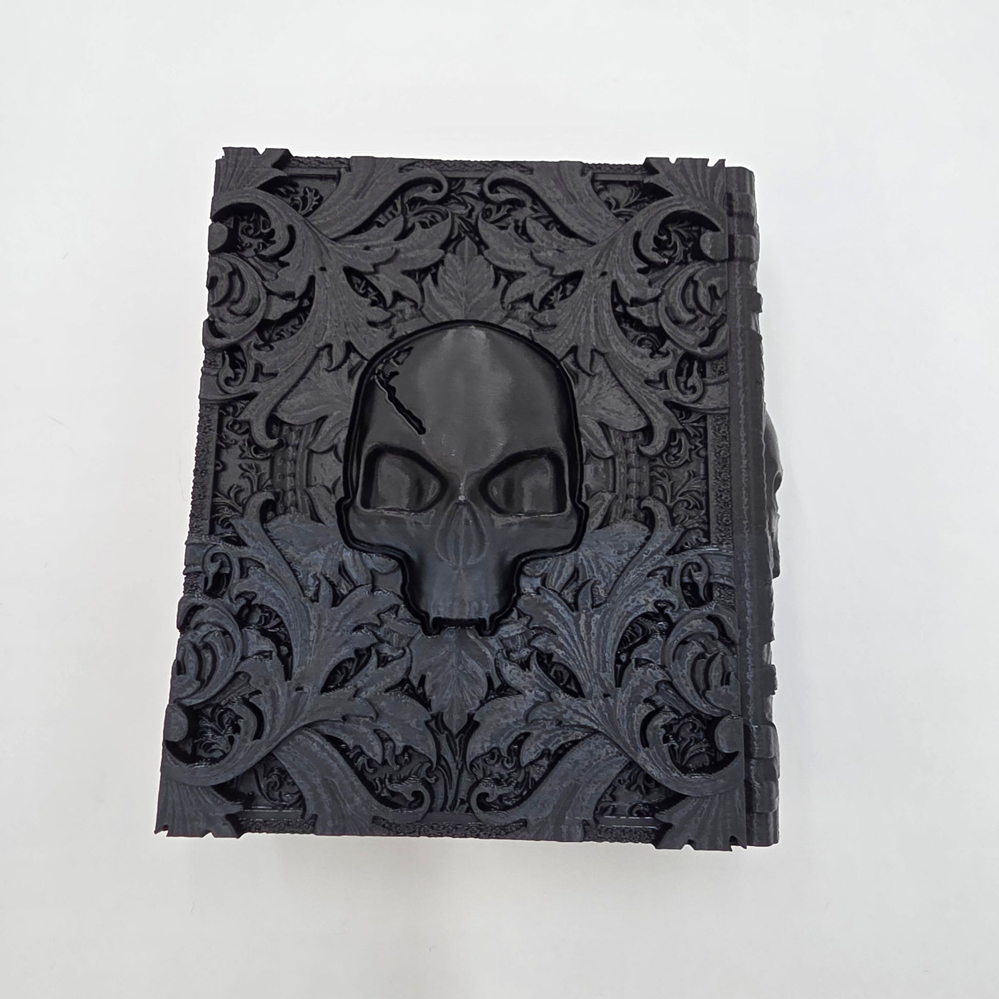Unleash dark fantasy at your game table with this D&D Death Tome, a 3D printed dice storage box designed to look like a cursed spellbook of the undead. Decorated with skulls on both covers and detailed gothic textures, this eerie tome conceals a hidden compartment — the center slides upward to reveal space for dice, tokens, or other small treasures.