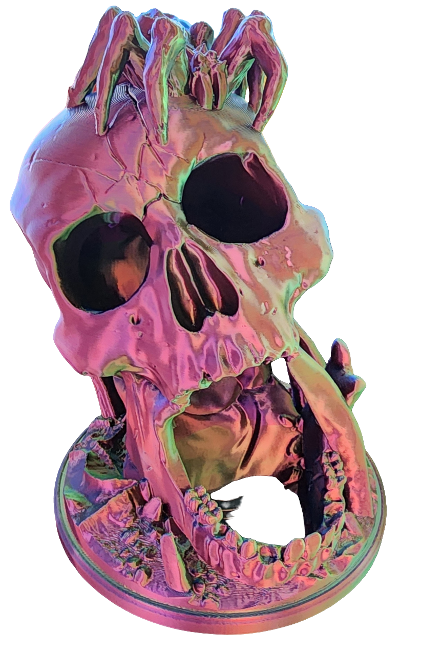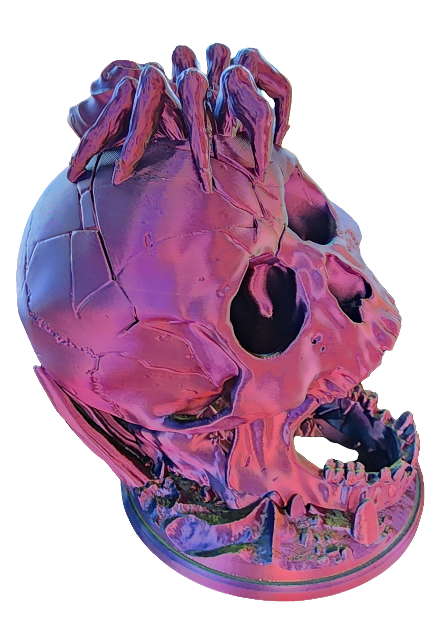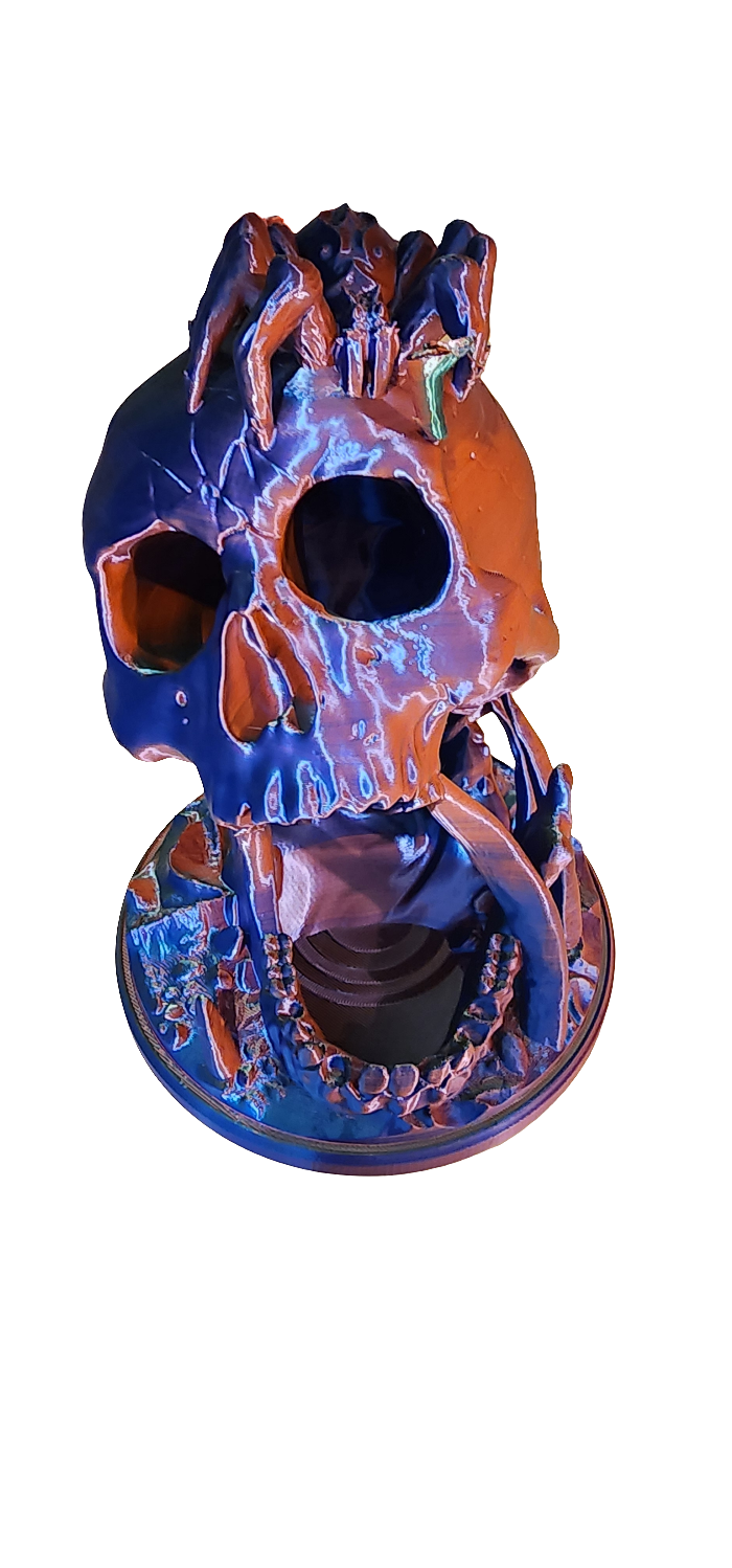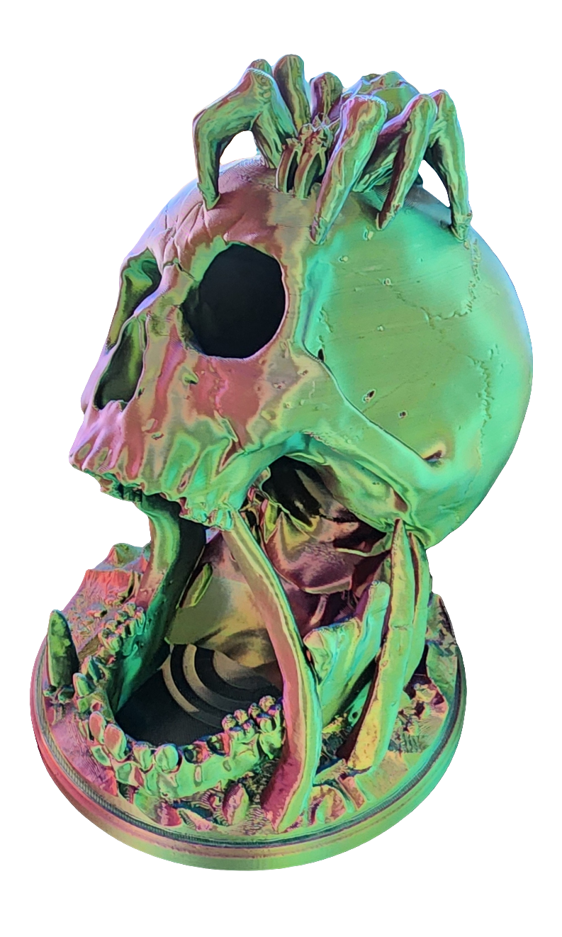 Add a touch of eerie elegance to your tabletop games with this spine-chilling 3D printed dice tower! Featuring a human skull with a sinister spider perched on top, this design lets you drop your dice through either eye socket, where they roll through the skull and emerge from its gaping mouth. A perfect blend of functionality and gothic style, it’s a must-have for horror and fantasy enthusiasts alike!